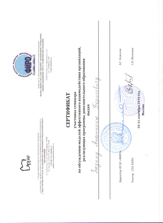 | 10-11.09.2014 | Семинар по обсуждению моделей эффективного взаимодействия организаций, реализующих программы дополнительного образования | СПб АППО |