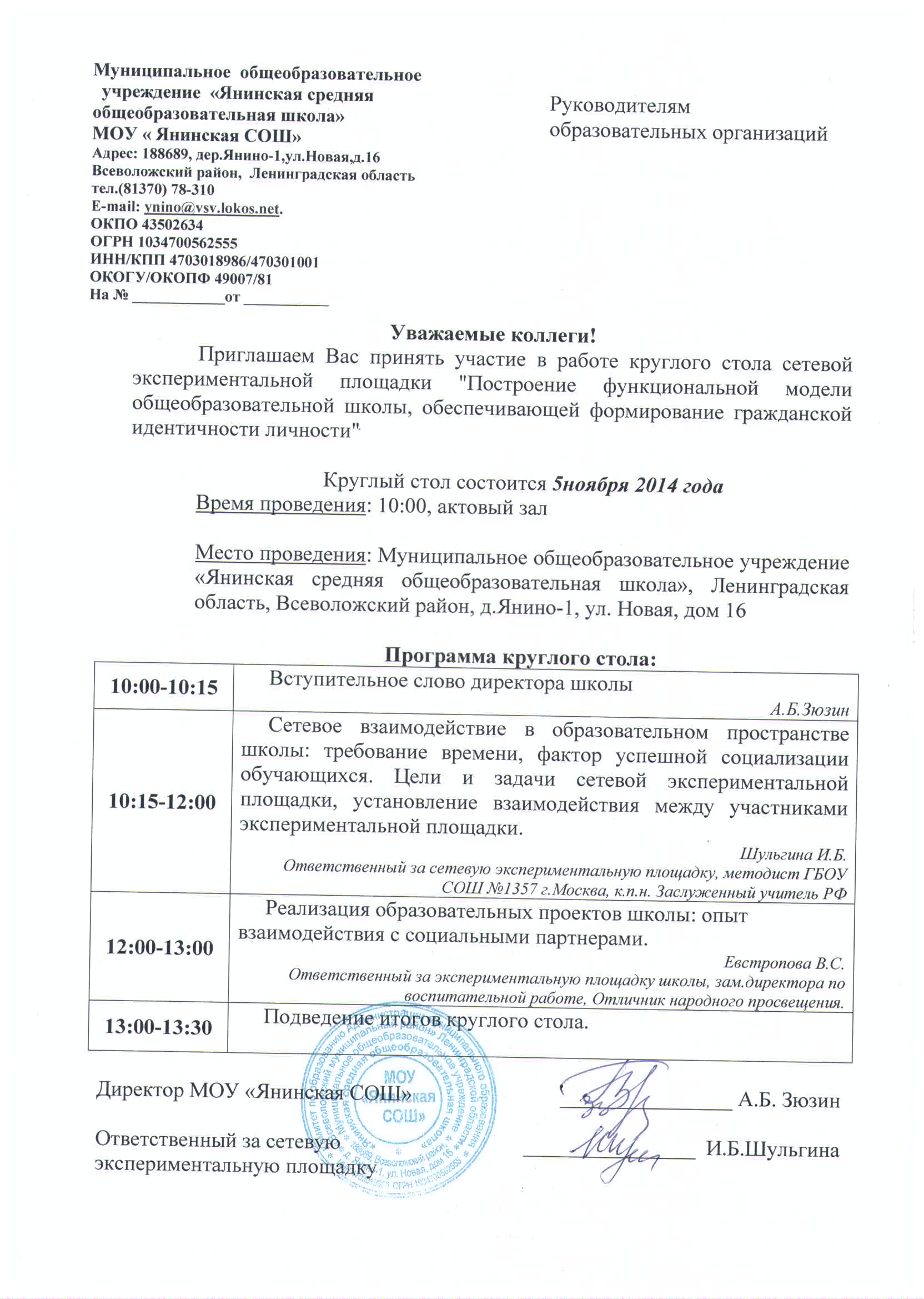 | 05.11.2014 | Круглый стол: «Построение функциональной модели общеобразовательной школы, обеспечивающей формирование гражданской идентичности личности" |